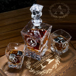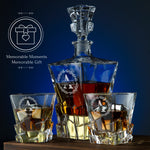 The 24 oz Rocks-collection decanter and matching 11 oz glasses are hand-crafted from lead-free crystal, delivering brilliant clarity and weight that feels substantial in the hand. Personalize your decanter, glasses, or handcrafted pinewood box with initials, a name, or a meaningful date to create a keepsake that lasts a lifetime.