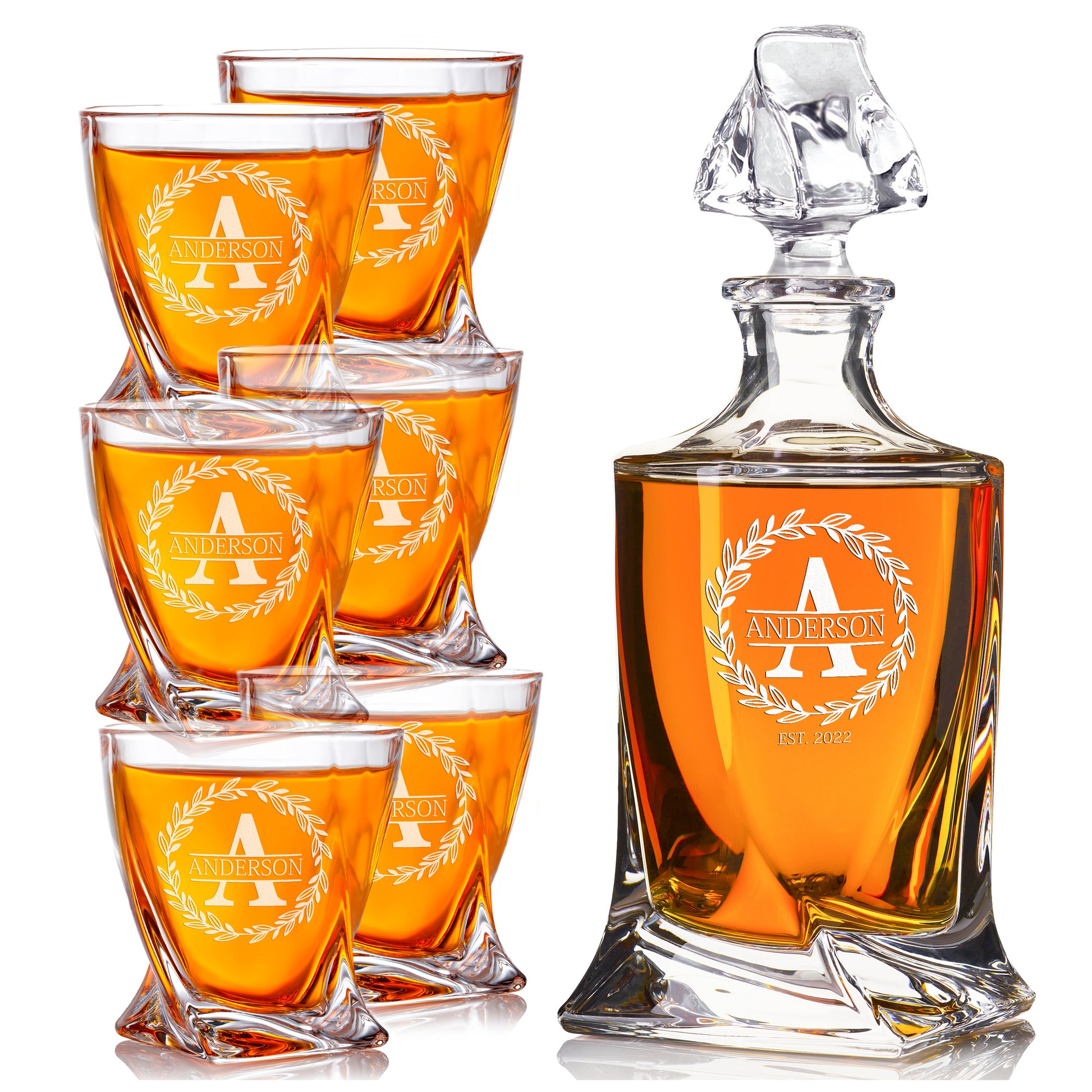 The set includes one twisted whiskey decanter and six matching twisted whiskey glasses.